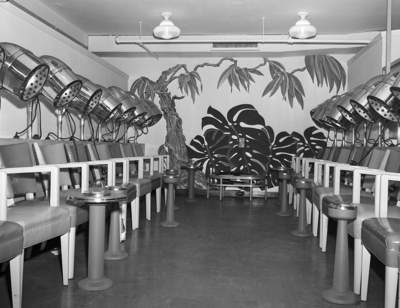 This is the attractive 20-unit drying room, decorated in shades of rose and blue, in The Fair's new beauty salon. Published in Fort Worth Star-Telegram morning edition May 14, 1950.