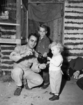 Harvey Roberts feeds a bird seeds while Billy Wood and Anne Norton stroke its feathers. Published in Fort Worth Star-Telegram morning edition January 17, 1954.