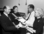 Reverend Oran Stephens, pastor of Central Methodist Church, and his wife, right, are serving Gus Oliver, chairman of the church board, left, and his wife venison at a church board dinner prepared by the Stephens's in the church kitchen. One hundred and fifty attended. The deer was bagged by Rev. Mr. Stephens on a ranch near Junction. Published in Fort Worth Star-Telegram evening January 13, 1954.