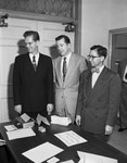 Registering for Ministers Week, which opened on the Texas Christian University (TCU) campus, are, left to right, Rev. Richard Brown, pastor of First Christian Church at Mineral Wells; Robert Lewis of Indianapolis, assistant secretary of the International Convention of Disciples of Christ, and Rev. Herbert W. Sprowls, pastor of First Christian Church at Kermit. Published in Fort Worth Star-Telegram evening January 12, 1954.