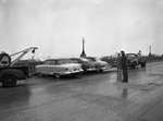 Crumpled fenders were routine sights as cars skidded out of control on icy spots. Typical were the three cars that nosed into the railing at the E. Belknap bridge and the six that tangled. The officer is Bob Holmes. Published in Fort Worth Star-Telegram evening January 13, 1954.