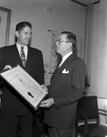 Fort Worth police department was cited for its big reduction in pedestrian deaths during 1952. A special American Automobile Association plaque honoring the city for its accident curtailment during that year was presented to Police Chief Hightower, left, by City Manager Jones, right. Fort Worth had only nine pedestrian deaths during 1952, a reduction of 19 from the previous year. Published in Fort Worth Star-Telegram evening January 13, 1954.