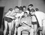 Featherweight Calvin Buckner, Light Heavyweight Craig Poteet, Bantam Ken Manning, Welterweight Jerry Buckingham and Lightweight Jimmy Coffman, left to right, gather around Coach H. L. (Dutch) Shults. Published in Fort Worth Star-Telegram evening January 15, 1954.