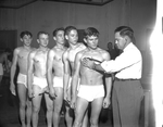Dr. M. C. Isbell checks heartbeat of Granbury High School entrant Richard Roberts as schoolmates E. B. Price and E. H. Davis (right to left) observe proceedings. All are in High School division of Star-Telegram's 18th Regional Golden Gloves tournament. Published in Fort Worth Star-Telegram morning January 15, 1954.