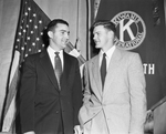 Gordon Long, left, and Lamar McHan chat at Kiwanis luncheon, where the former spoke prior and the latter received the Southwest Conference sportsmanship award. Both attended Arkansas University. Published in Fort Worth Star-Telegram evening edition January 15, 1954