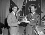Lamar McHan, Arkansas back, at left, receives Fort Worth Kiwanis Club's fourth annual Southwest Conference sportsmanship trophy from Club President Vic Thornton. Published in Fort Worth Star-Telegram evening January 15, 1954.