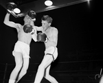 Johnny Klapper, left, of Arlington, backs away just in time to escape righthand punch thrown by Kenneth Taylor, Grapevine, in featherweight fight on the Star-Telegram's opening Regional Golden Gloves program Friday night. Taylor took decision victory. Published in Fort Worth Star-Telegram morning January 16, 1954.