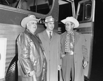 Left to right, M. W. Hovenkamp, J. Y. McClure and J. D. Thompson, shown ready to leave for a Southwestern Exposition and Fat Stock Show booster trip. Published in Fort Worth Star-Telegram evening edition January 15, 1954.