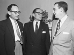 Philip M. Klutznick, center, of Park Forest, Illinois, national president of B'nai B'rith, visits with Milton Mehl, left, chairman of the committee who arranged the Jewish leader's visit to Fort Worth, and Jerry Wolens, president of the L. F. Shanblum Lodge, B'nai B'rith. Published in Fort Worth Star-Telegram morning edition January 16, 1954.