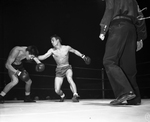 Ronald Cheek, right, heavy-hitting West Side Gym welterweight, aims a second-round at Johnny Guerrero of Carswell AFB. Cheek won on a second-round TKO to set up a bout with another slugger. Published in Fort Worth Star-Telegram morning January 18, 1954.