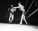 Right to chin straightens Birdville's Donald McCurry, left, as he takes punch thrown by Bill Pitts of Handley. Pitts earned decision in high school welter fight of Star-Telegram's Regional Golden Gloves Saturday night. Published in Fort Worth Star-Telegram morning January 17, 1954.