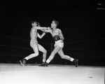 Straight-punching Walter Smith of Poly, right, connects with eye of Richard Hayes in high school flyweight battle. Smith gained nod over Diamond Hill opponent to advance in huge Regional Golden Gloves tournament. Published in Fort Worth Star-Telegram morning January 17, 1954.