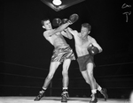 Dub Kelly, right, who will be Cheek's opponent comes close with an overhand right against Sid Pettigrew of Alvarado. Kelly won on a TKO in the first round. The Cheek-Kelly bout will be one of 45 as the Star-Telegram's 18th annual tournament heads toward a climax. Published in Fort Worth Star-Telegram morning January 18, 1954.