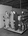 Ted Freeman, left, chief of plant protection for General Motors' Arlington plant, inspects equipment at the back of a new $17,000 fire truck. Shown with him are Tom Lee, center, investigator with the Arlington Police Department, and Arlington Fire Chief Mike Thompson. Published in Fort Worth Star-Telegram morning edition January 18, 1954.