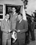 Left to right, Glen Calhoun, J. J. Duncan, and Weldon Lucas are shown gathered, shortly before 19 members of the of the Arlington Heights Lions Club traveled by bus to attend a luncheon held by the Cleburne Lion's Club. An unidentified man is visible standing to the right of the image. Published in the morning edition, May 13, 1950.