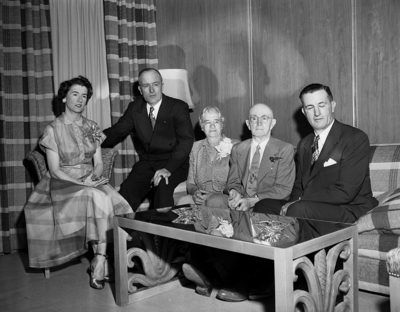 Celebrating his 80th Birthday, Ed S. Hill, sitting second from the right, entertained with a dinner for his family, office force, and friends, at the Fort Worth Club. Left to right, his daughter, Mrs. Julian Meeker; his son, Houston Hill; his wife, Mrs. Hill; himself, and their other son, George P. Hill. Published in the morning edition, May 17, 1950.