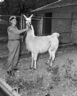 Jim Brown, assistant director of Forest Park Zoo, tells the zoo's new female llama to "look at the birdie." The white llama, purchased by the Fort Worth Zoological Society from the Oklahoma City Zoo, will be joined soon by a black male llama, bought by the society from the zoo in Colorado Springs. The new comer show here will be on exhibition in the Zoo. Published in Fort Worth Star-Telegram evening edition May 13, 1950.