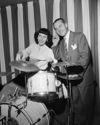 Bebe Kay and Bandleader Johnny Singer spent a few minutes at the rehearsals, playing Troy Hatcher's drums. Their more serious moments will come at dance time in the Keystone Room.