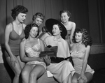 Miss Jacque Mercer, 19, Miss America titlist, presented miniature cedar chest to the five beauties she helped pick for Fort Worth news photographers. The contestants, shown dressed for a swim, will compete with a similar group from Dallas for Miss Press Photographer of Dallas-Fort Worth area. Left to right, back row, are Shirley Price and Evelyn Nitsch, and in front are Patsy Norcross, Jo Anne English, Miss Mercer and Lois Gaulden. Published in Fort Worth Star-Telegram evening edition May 13, 1950.