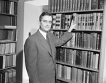 John Reeves, elected Texas League president, reaches for a law book in the new league office at the Hilton Hotel. The office was moved to Fort Worth after a 24-year absence. Published in Fort Worth Star-Telegram morning edition January 24, 1954.