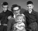 Mrs. D. J. Raaz, wife of Lieutenant Colonel Raaz, was elected president of Carswell Air Force Base Officers Wives Club. She is shown here with her children, Dee, 2, and standing, left to right, Dana, 8, and Dick, 9. Published in Fort Worth Star-Telegram evening edition January 27, 1954.
