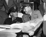 Major General Bernard L. Robinson, left, and Colonel Herbert D. Vogel check a map of the upper Trinity River projects during a press conference in a United States Corps of Engineers plane after an aerial inspection of the area. Published in Fort Worth Star-Telegram morning edition January 24, 1954.