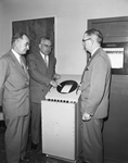 William Russell Thickstun of Washington, chief of the instrument divisions of the United States Weather Bureau, points to the scale of the new ceilometer in the bureau's offices at Amon Carter Field, while A. J. Knarr, right, senior meteorologist, and Raymond A. Powell of Washington, chief of Weather Bureau electronics maintenance, discuss the instrument. Published in Fort Worth Star-Telegram morning edition January 26, 1954.