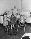 The photograph shows children, patients in the polio ward at City-County Hospital. Left to right, Donna Kay Williams, Ruby Rhodes, Steven Miles (in bed) and Mike Hudgins. All will benefit from the Mothers' March for the March of Dimes. Published in Fort Worth Star-Telegram evening edition January 28, 1954.