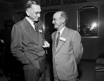 These two neighbors traveled more that 150 miles to discuss business in their own back yards. Left, John Q. McAdams, president of the Winters State Bank, drew a chuckle from Ralph G. Erwin, president of the First National Bank at Ballinger. Published in the morning edition, May 15, 1950.