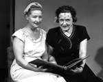 Countess Maria Zichy, right of the Zichy Academy of Fine Art in New York, and Mrs. Robert Parham of Dallas look over a portfolio of photographs of portraits the countess has painted. Mr. and Mrs. Parham and Countess Zichy recently visited with her brother-in-law and sister, Dr. and Mrs. Jack Daly, 2200 Huntington Lane. The countess is in Texas to execute a series of commissions. Published in Fort Worth Star-Telegram morning edition February 10, 1954.
