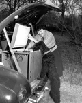 The dog, Jopo (a gift from Actress Patsy Kelly) is very interested in his mistress' maneuvers in unpacking a kiln which she brought all the way from New York. The ceramist is Mrs. Ruth Denice Lauer, guest of Mr. and Mrs. G. A. Nicolson, 4701 Meadowbrook Drive. Published in Fort Worth Star-Telegram morning edition February 7, 1954.