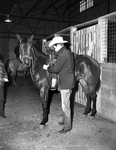 Pat LeBean of Denton gives Badger's Brown Baby's gear a last-minute check before riding the cutting horse in eliminations at Will Rogers Memorial Coliseum. Published in Fort Worth Star-Telegram evening edition January 27, 1954.