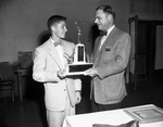 Junior Halfback Max Blankenship (left) gets Moslah Drum Corps award from Hugh Craig during banquet honoring Masonic Home football team. Award is for sportsmanship, scholarship, citizenship. Published in Fort Worth Star-Telegram morning edition January 29, 1954.