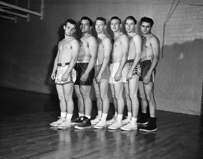 Left to right are Decatur Baptist College Golden Gloves entries Hugh Hamm, Adolph Torres, Milton Oswalt, Lavon Means, Bill Burns, and Melio Marchioni, all former Fort Worth High School athletes. Published in the Fort Worth Star-Telegram evening edition, January 5, 1950.
