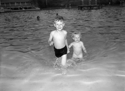 Rickey Ezzell, 6, 4121 McCart, guides a reluctant Linda, 2, out of Forest Park Pool after his sister has made her swimming debut and enjoyed it so much she did not want to leave. Published in Fort Worth Star-Telegram morning edition May 15, 1950.