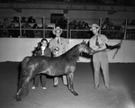 Lazy N's Dream Girl, owned by Lazy N. Stables of Winters, took the grand championship for halter class Shetland mares at the Southwestern Exposition and Fat Stock Show. At left is Nancy Norman, daughter of John Norman, owner of the stables, receiving trophy and rosette from James Boswell. At right is Vern Brewer, trainer. Published in Fort Worth Star-Telegram morning edition January 30, 1954.