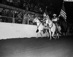 Governor Shivers, left, extends and official handshake to one of the color bearers in the rodeo grand entry parade that kicked off the 1954 edition of Southwestern Exposition and Fat Stock Show. Published in Fort Worth Star-Telegram evening edition January 30, 1954.
