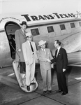 Deplaning at Carter Field on the inauguration of Trans-Texas Airways new service to Coleman, Texas were Coleman's Mayor W. O. Leach, being greeted by W. W. Blanton of Trans-Texas, right; E. F. Smith Jr., Board of City Development (BCD) president, behind Leach, and Clyde D. Allen, rear, chairman of the BCD aviation committee. Published in Fort Worth Star-Telegram evening edition January 29, 1954.