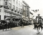 Stock show parade in downtown Fort Worth, Texas; from left, W.R. Watt, president and general manager; Verne Elliott, rodeo producer; and Ernest Allen, parade marshal and vice president; Fakes and Penney's department stores in background, 01/30/1954