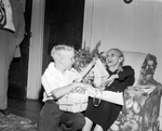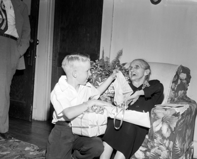 Mrs. Nancy Katherine Ryan, 92, who was honored as the oldest mother present at services at Morningside Baptist Church, receives congratulations from her great-grandson, Bobby Thrash, 11, of Dallas, at her home, 1500 E. Maddox. Published in Fort Worth Star-Telegram morning edition May 15, 1950.