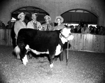 Bobby Zane Egger, 18, Mills County 4-H Club boy owned and exhibited the grand champion steer in the junior show of the Southwestern Exposition and Fat Stock Show. Shown with the 1,000-pound Hereford are left to right; W. R. Watt, president and manager of the Stock Show, Jess Andrew, president of the International Livestock Exposition, Chicago; George Reese, county agent in Mills County, and Egger. Published in Fort Worth Star-Telegram morning edition January 31, 1954.