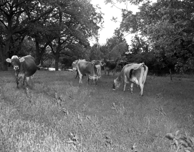 Image shows a herd of registered Brown Swiss cattle grazing on pasture on Holland and Johnson ranch near Abilene. Published in the Fort Worth Star-Telegram morning edition, September 3, 1950.