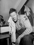 Wilburn Plaugher, rodeo clown, shown removing his makeup. Published in Fort Worth Star-Telegram evening edition February 1, 1954.