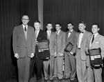 These boys from Iowa State College swept most honors in the Southwestern Exposition and Fat Stock Show livestock judging contests. Left to right are James J. Kiser, team coach; George Loupee, Dick Eddleman, Joe Cooper, Frank Enfield, Ben Kelly, high man of the contest, and Wayne Smith. Published in Fort Worth Star-Telegram morning edition February 1, 1954.