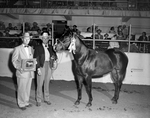 Raymond Hollingsworth of Amarillo, left, secretary of the American Quarter Horse Association, presents the association award to Ed Heller of Dundee for winning the grand championship for Quarter horse mares with Suits Me H., a 4-year-old. The rosette pinned on the mare's halter was for winning the crown at the Southwestern Exposition and Fat Stock Show. Published in Fort Worth Star-Telegram morning edition February 1, 1954.