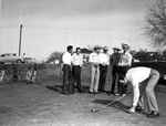 Carl Mendez tees up his ball, as six other cowboys wait for their turn to belt a ball. They are, left to right, Sonny Trueman, Jack Buschbom, Jim Like, Gene Pruett, Bull Rush and Buff Douthitt at the Rockwood golf course. These rodeo circuit riders have started trying busting par in their leisure time. Published in Fort Worth Star-Telegram evening edition February 4, 1954.