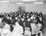 Members of the Polytechnic High School Band taking time out before the Texas Tech gridders arrive to have a meal in the Sky Chef Dining Room at Amon Carter Field. Published in Fort Worth Star-Telegram morning edition January 2, 1953.