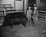 Champion pen of three Aberdeen Angus bulls was shown at the Southwestern Exposition and Fat Stock Show by Rose & McCrea of Maysville, Mo. Shown in this picture are, left to right, M. L. McCrea and Jack Bourland, assistant superintendent of the bull carload and pen division of the stock show. Published in Fort Worth Star-Telegram evening edition January 29, 1954.