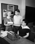 A grandmother, mother, and son get together to attend the same typing class at Technical Evening School. Left, Mrs. Louise Harris Sr., the mother, Mrs. Leona M. Smith, the grandmother, and Louise Harris Jr., the son. Published in Fort Worth Star-Telegram evening edition February 1, 1954.