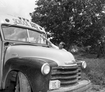 Image shows Weldon Johnson, polishing school bus that he drives during school term, he raises Brown Swiss cattle at Hawley. Published in the Fort Worth Star-Telegram morning edition, September 3, 1950.